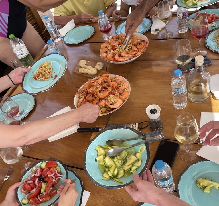 Taste delicious dishes and fresh salads prepared on board with complimentary wine, tsipouro and soft drinks to our spacious dinning area to our deck.