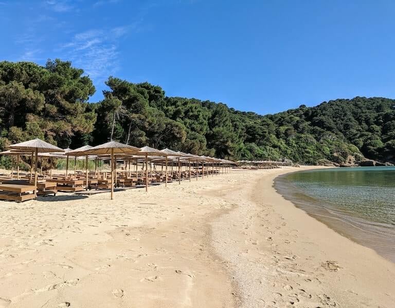 Sail to Skiathos, an island famous for its golden beaches, lively atmosphere, and hidden coves.