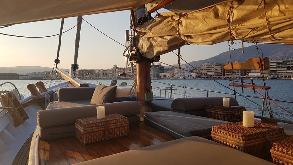 The evening begins with a welcome drink — a glass of chilled wine, a refreshing cocktail, or a sip of tsipouro, the spirit of the Greek islands. Find your favorite spot on deck: stretched across a soft sunbed, seated at the open-air dining area, or simply barefoot on the polished teak wood. As the music plays softly in the background, you can dance, daydream, and lose yourself in the rhythm of the sea.